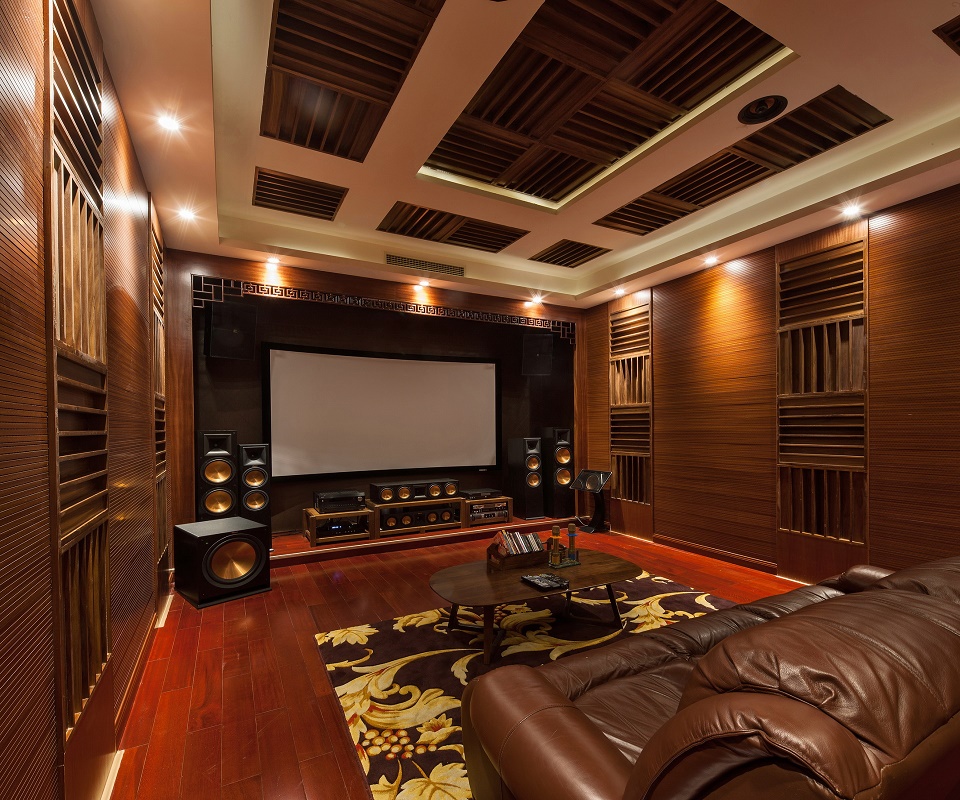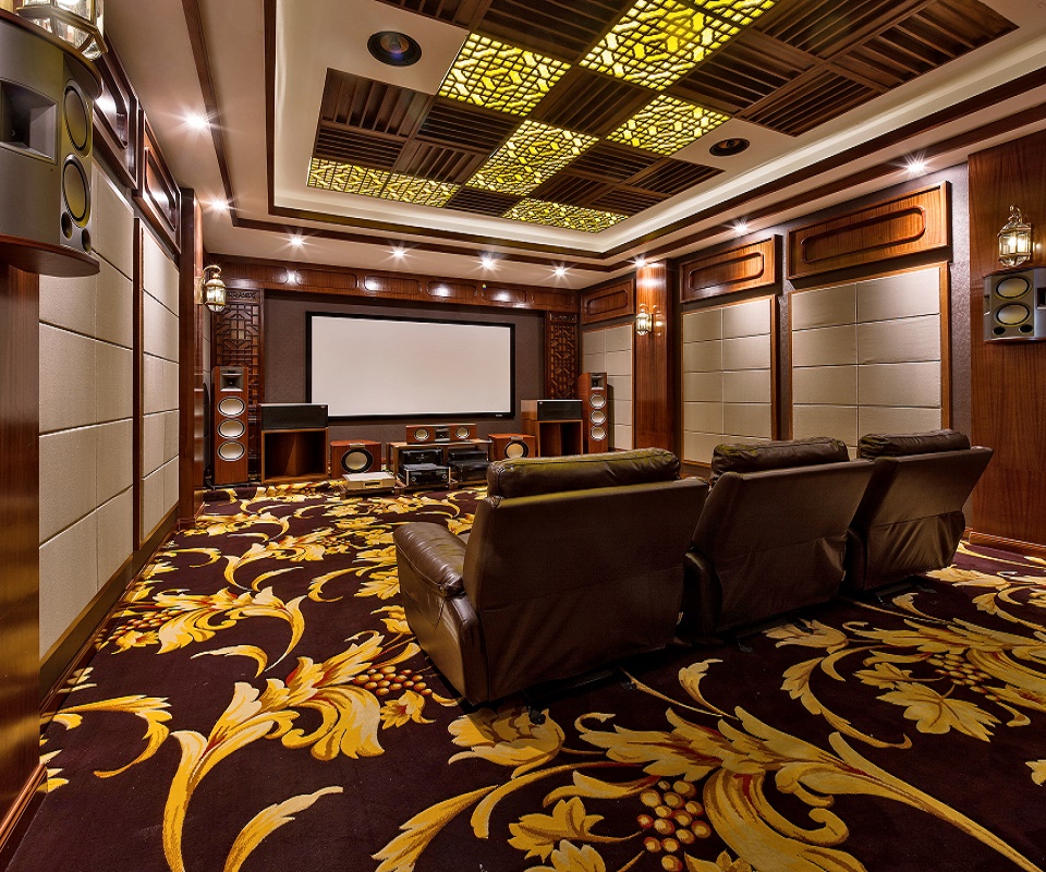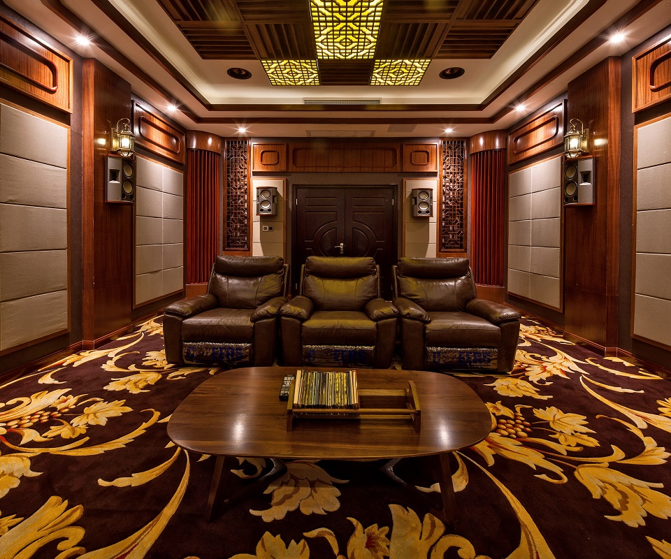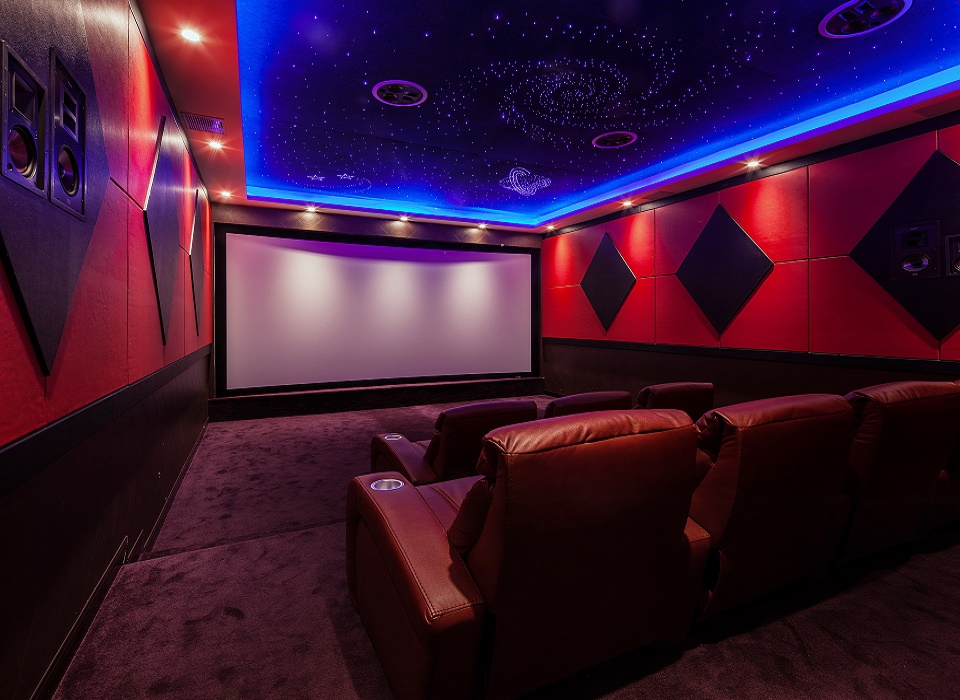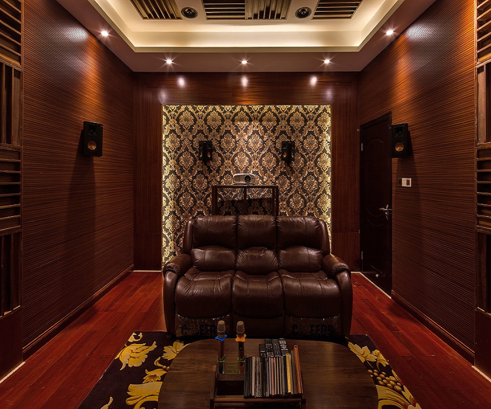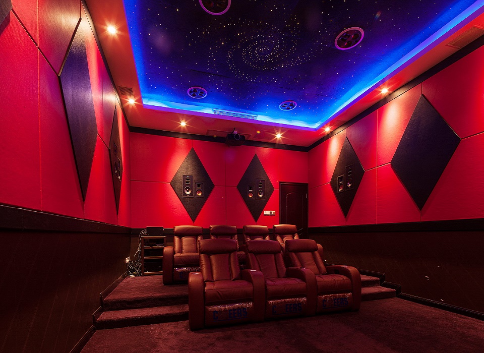 專業影院廳面積80平方,采用最新9.2.4全景聲配置,音箱采用杰士專業箱,功放采用美國BGW,搭配250寸大型弧形畫框透聲屏幕,愛普生激光工程機。
