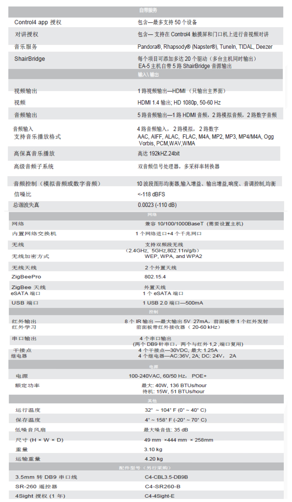 安全、無線無線個域網通信;豐富的I/O,包括IR,串行,接觸和繼電器;而IP控制可以連接到智能家居設備,如恒溫器、門鎖、門鈴、攝像頭、安全面板、傳感器、照明、遮光、車庫門控制器、灌溉系統等等。圓滑的設計、機架的外形以及頂級的連接性使EA-5成為任何控制系統的終極基礎,也為智能家居的未來提供了動力。