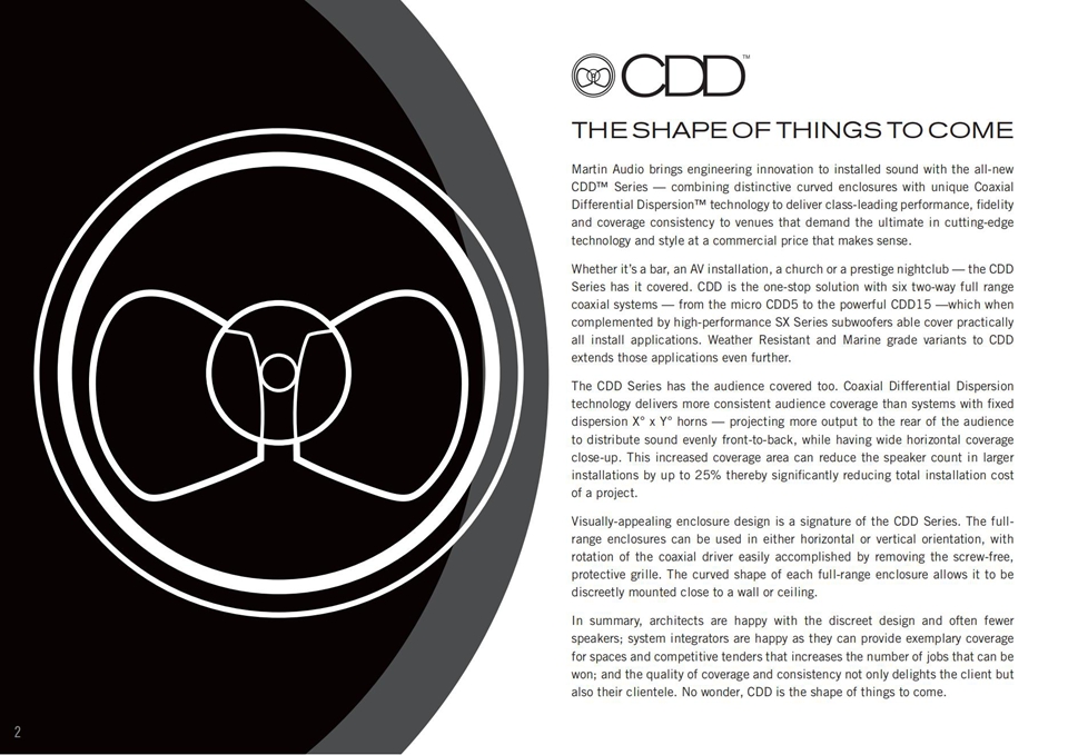 Martin Audio憑借全新的CDD系列產品,為擴聲領域固定安裝市場帶來新的技術創新——該系列產品將具有獨特弧形的外觀設計和市場上獨一無二的同軸差異化離散技術相結合,為那些追求尖端技術與品質的終極性的場地帶來同級別領先的性能、解析度和覆蓋統一性。