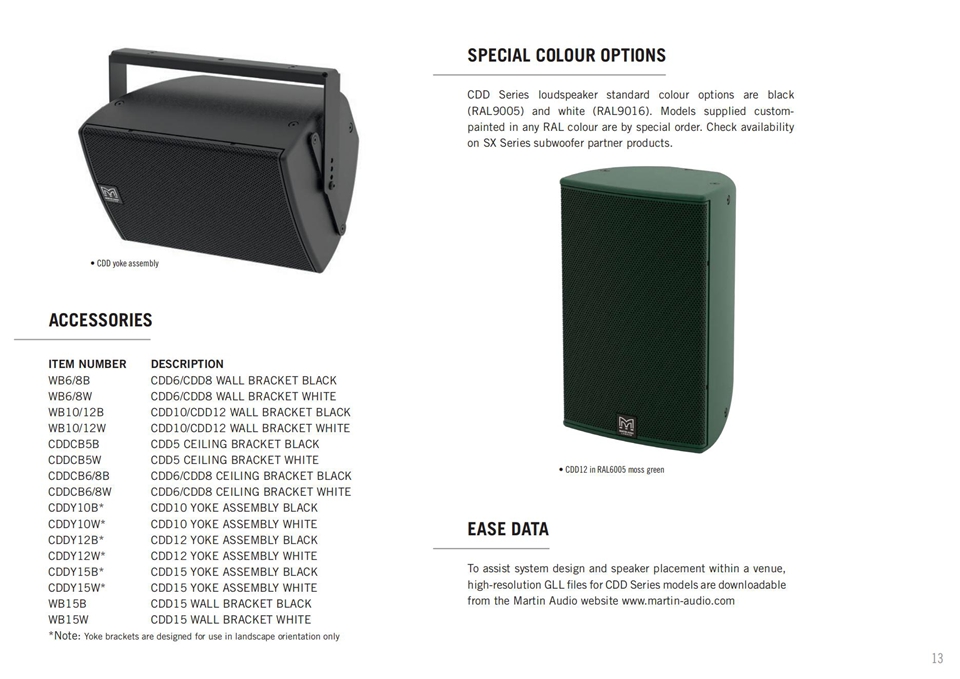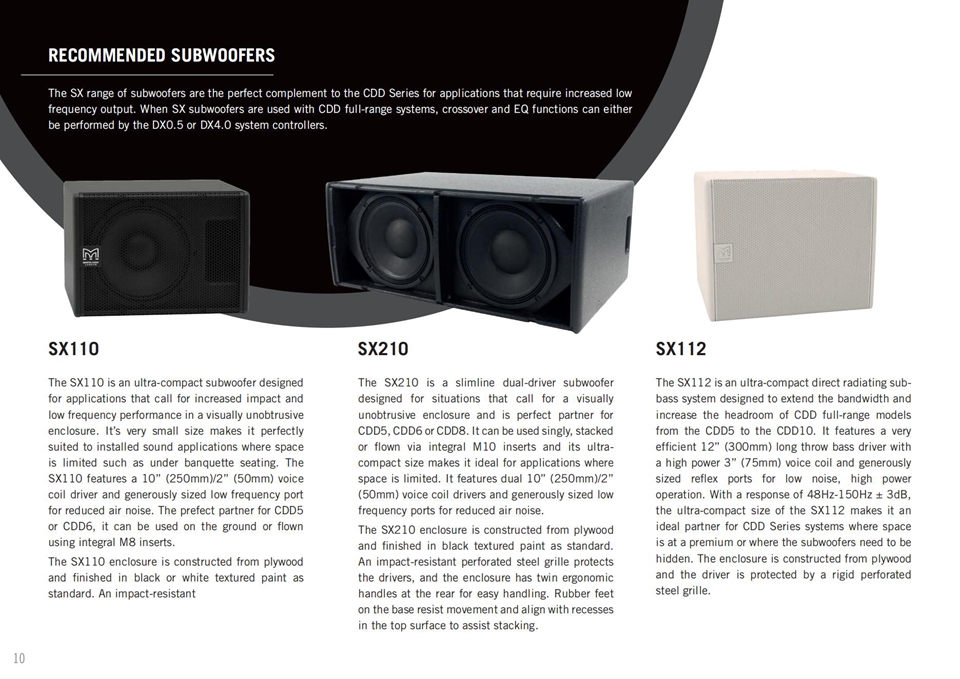 無論是一個酒吧、一個音視頻固定安裝工程、教堂或極富聲望的夜總會,CDD系列都可以滿足它們的需求。CDD被證實是一種一站式解決方案;六種雙向全頻的 同軸系統——從微型的CDD5一直到強力的CDD15,搭配高性能超低音揚聲器——涵蓋了基本上所有的安裝應用環境。