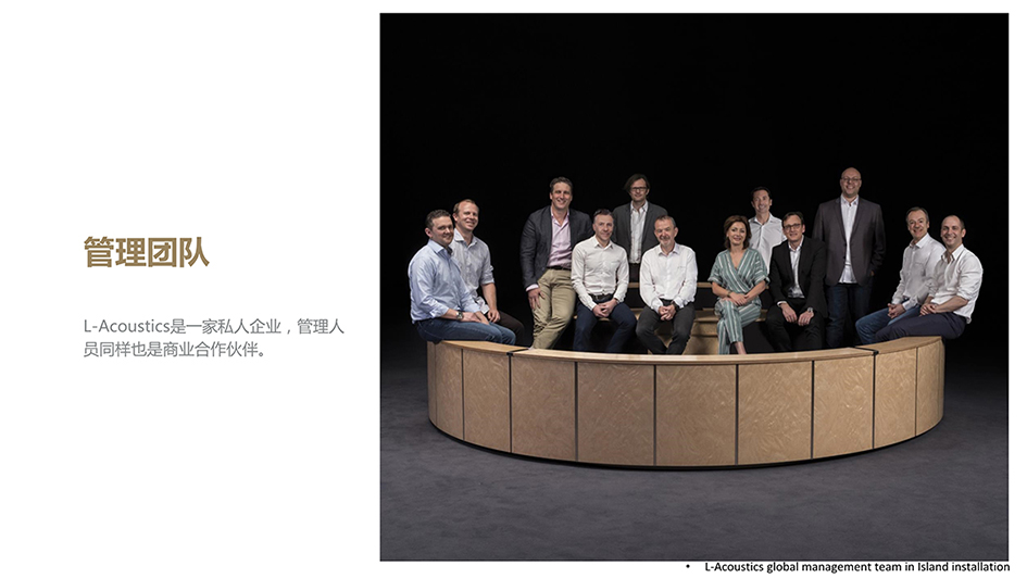 L-Acoustics是一家私人企業,從管理的角度來看,公司能夠保持穩定是因為執行團隊的成員同時也是公司的股權合伙人。這種專業音響行業中資深人士的獨立特性和管理能力有助于公司保持以客戶為中心的運作方式。